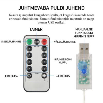 - 8 dažādas gaismas programmas (kombinācija, vilnis, dažāda mirgošana, lēna spīdēšana, mirgošana, lēna dzēšana, mirgošana, vienmērīga degšana)